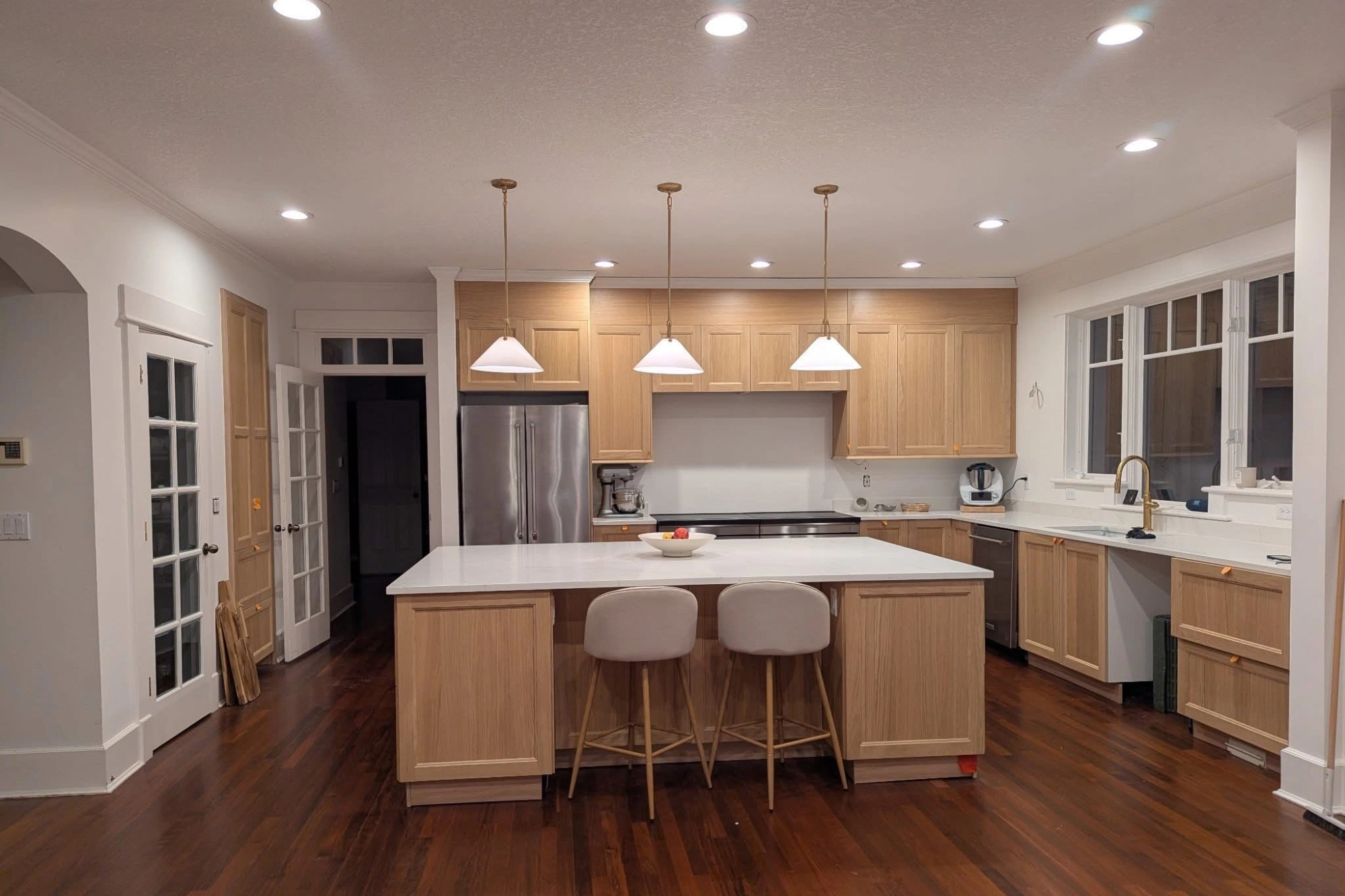 This home remodel was highlighted by this classic White Oak Cabinet and quartz countertop kitchen remodel. Hardwood Floors were preserved by a beautiful refinish. Tasteful fixtures were chosen between the customer and our in house designer.